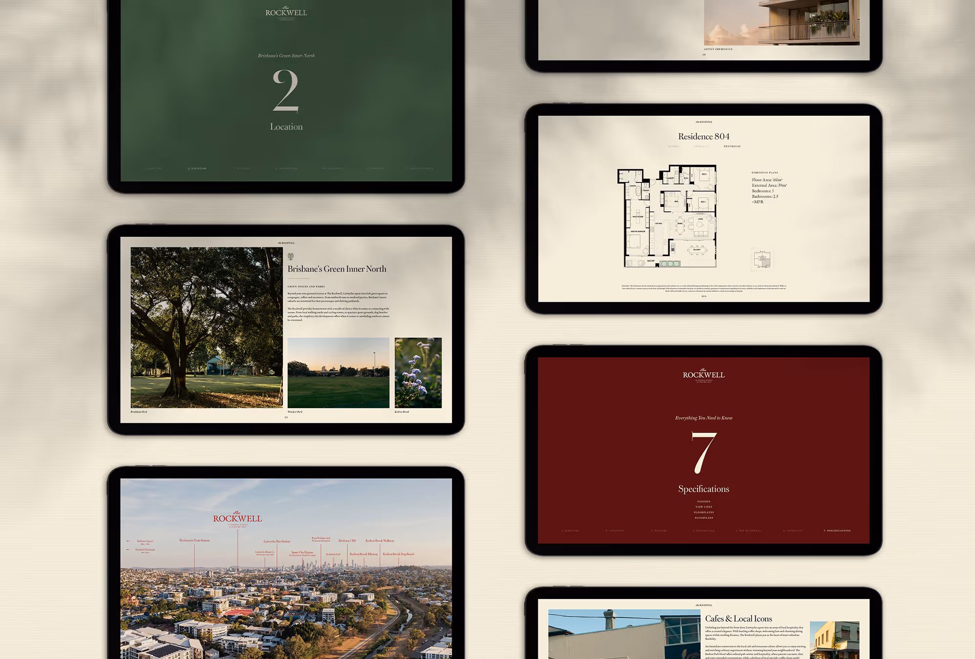 As a project, The Rockwell is defined by a careful interplay between clarity and softness. Its architecture captures natural light and elevated views, creating homes that feel open, grounded, and inherently connected to place. Interior and exterior spaces flow seamlessly, embracing Brisbane's breezy character and fostering a sense of calm, everyday luxury. This architectural language, at once resolved and inviting, directly informed the branding approach.